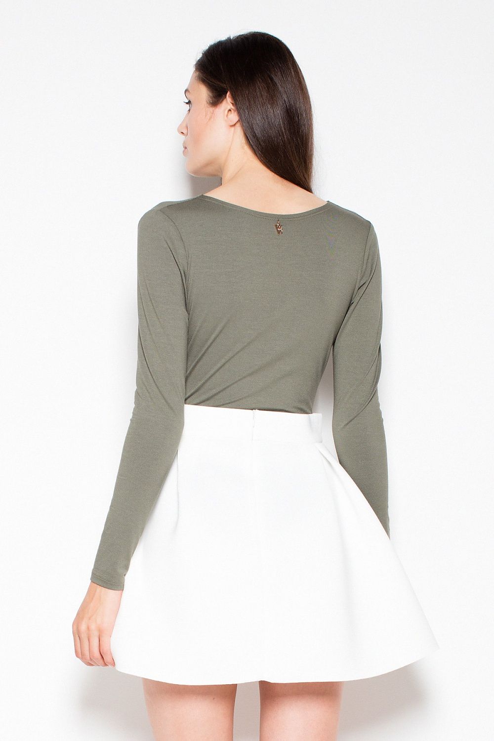 Fitted long-sleeved bodysuit with an effective flowing neckline. A model perfectly matching tight, classic jeans.